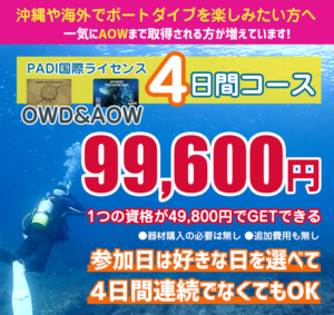 OWD+AOW4日間いつでも99,600円 年間で最もお安い金額でご案内中です!PADI OWD2日間 AOW2日間のセット4日間コースがいつでもこのお値段(閑散期料金よりさらにお安く1つの資格が49,800円で取得可能 […]