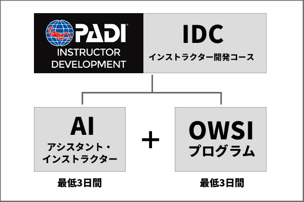 AIコース(最低3日間)OWSIプログラム(最低3日間)を連続して組み合わせたものがIDC(6日間)となります。